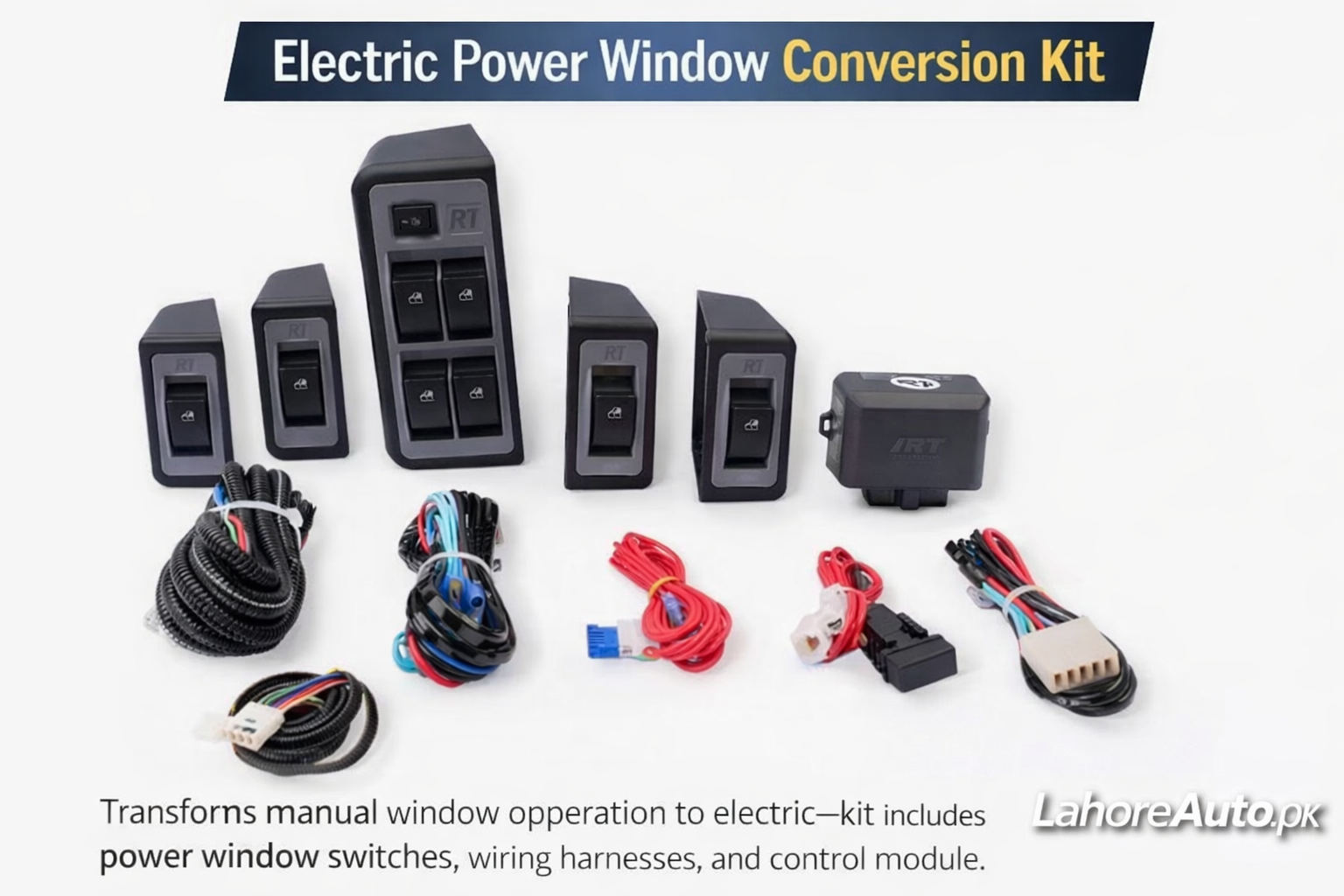Electric Power Window Conversion Kit – This complete set upgrades manual car windows to automatic operation. It includes window regulators, motors, control module, switches, and wiring harness. Easy to install, smooth performance, and suitable for most vehicles
